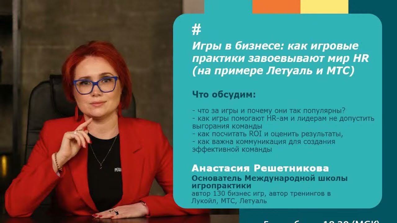Подробнее о нас: Международная Школа Игропрактики Международная Аккредитация Игропрактиков (IFG) Мы в социальных сетях: https://www.instagram.com/school_igropraktika - актуальные новости https://vk.com/school_igropraktika - актуальные новости https://dzen.ru/id/620bc811d9e9643d051123d8 - полезные статьи https://t.me/reshetnikovalive - тренды в мире помогающих специалистов https://t.me/+8pQL7FooZ2A0OTli - служба поддержки/поиск помогающего специалиста Что мы обсудим: - что за игры и почему они так популярны? - как игры помогают HR-ам и лидерам не допустить выгорания команды - как посчитать ROI и оценить результаты, которые вы получите - как важна коммуникация для создания эффективной команды _______________________________________________________________________ Канал в телеграм HR Mindset https://t.me/+Z1McwVX8CDkxMTJi Канал Анастасии Решетниковой https://t.me/reshetnikovalive Курс по созданию игры Хотите создать собственную игру, напишите нам https://schooligropraktika.com/help ______________________________________________________________ #деловыеигры #бизнесигра #скачатьбизнесигру #игрыпробизнес #бизнесигракупить #игровыепрактики #hr #рекрутинг #кадры #трансформация