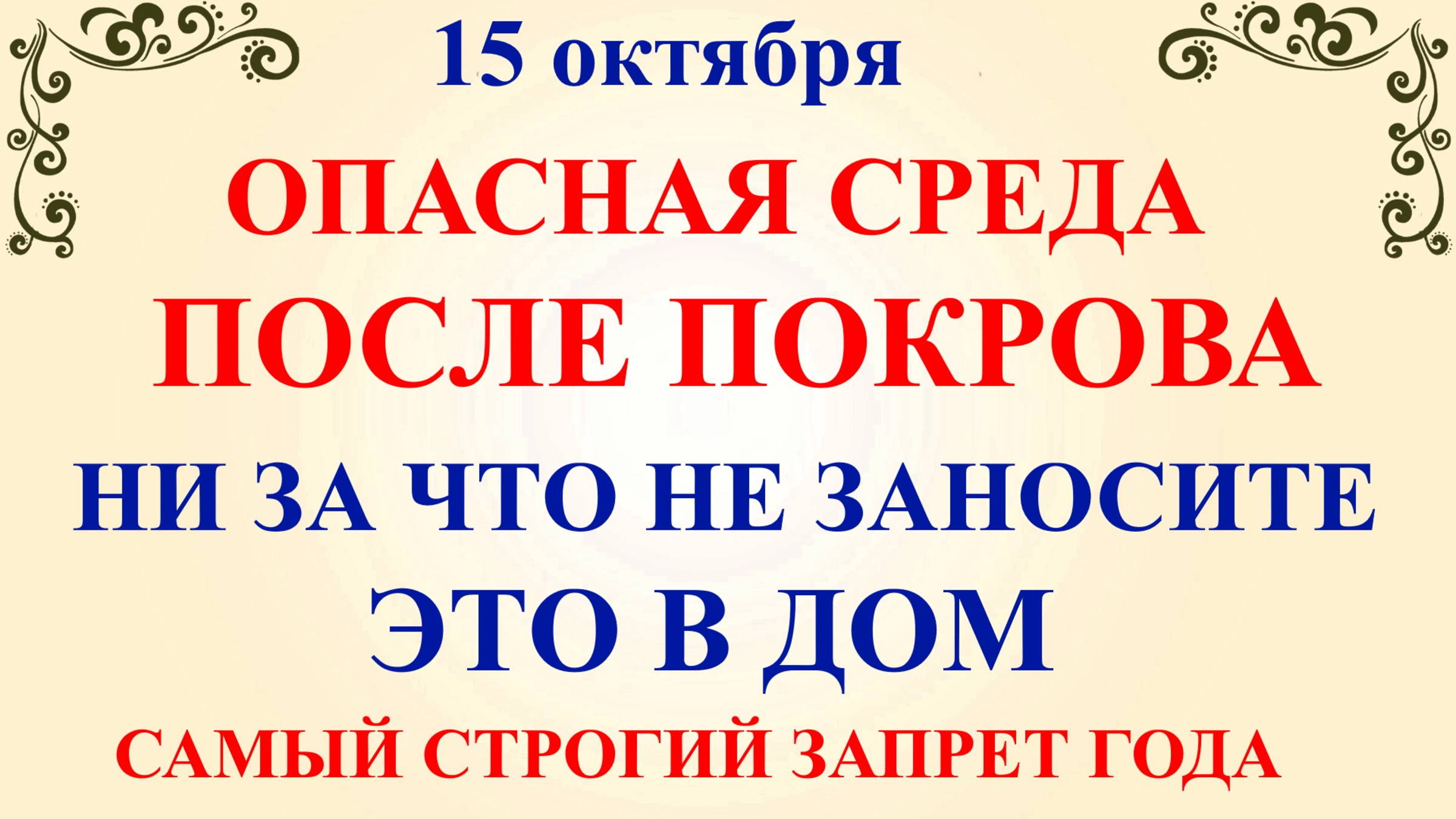 15 октября народный праздник Куприянов День, День Устиньи и Куприяна. Что нельзя делать 15 октября. Народные традиции и приметы и суеверия 15 октября. По церковному календарю 15 октября чтут память священномученика Киприана и мученицы Иустины! Эти Святые издревле считаются защитниками от нечистой силы, чар и колдовства. В старину этот день называли бесовским и страшным! Наши предки считали его очень опасным, так как в этот день человек плохими поступками мог привлечь к себе многие злые силы. На Куприяна и Устинью нужно обязательно читать молитвы спасения от нечисти! Если Вам понравилось народный праздник Куприянов День, приметы погоды 15 октября праздник, какой сегодня праздник отправить по Viber, whats app, а также поделиться в социальных сетях vkontakt, odnoklassniki! Куприянов День 15 октября ссылка на видео на нашем Ютуб канале: https://youtu.be/NaWxWSTlCUI ✅ Подпишитесь на Народные Праздники в Телеграм https://t.me/nprazdniku Благодарю за подписку! Подписывайтесь на канал прямо сейчас!❤️️❤️️❤️️ОБЯЗАТЕЛЬНО нажмите на колокольчик 🔔. Все изображения и музыка в видео используются по лицензии CC0 Creative Commons, так же содержатся видео и фото из личного архива. Видео на канале создано по принципу FAIR USE. Фото и видео обрабатываются в видео и фоторедакторе, таких как Movavi Video Editor, Adobe Photoshop. Использование моих видео запрещено! Благодарю всех за просмотр! Будьте здоровы!