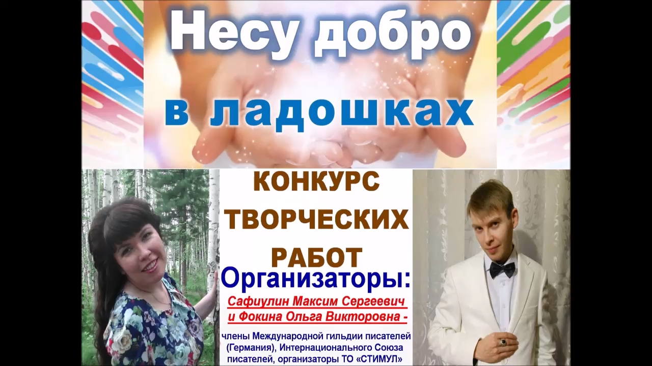 Конкурс "Несу добро в ладошках!": http://proza.ru/2017/09/17/447 Все стихотворения Максима Сафиулина: http://www.stihi.ru/avtor/safmaxser Избранные стихотворения Ольги Фокиной: http://www.proza.ru/2018/07/08/850 ОТЗЫВЫ ЧИТАТЕЛЕЙ КНИГ МАКСИМА САФИУЛИНА И ОЛЬГИ ФОКИНОЙ: http://www.proza.ru/2019/11/29/611 БИОГРАФИЯ САФИУЛИНА МАКСИМА СЕРГЕЕВИЧА:http://www.proza.ru/2019/10/08/1461 БИОГРАФИЯ ФОКИНОЙ ОЛЬГИ ВИКТОРОВНЫ (в т.ч. список публикаций и достижений):http://www.proza.ru/2019/10/08/1473