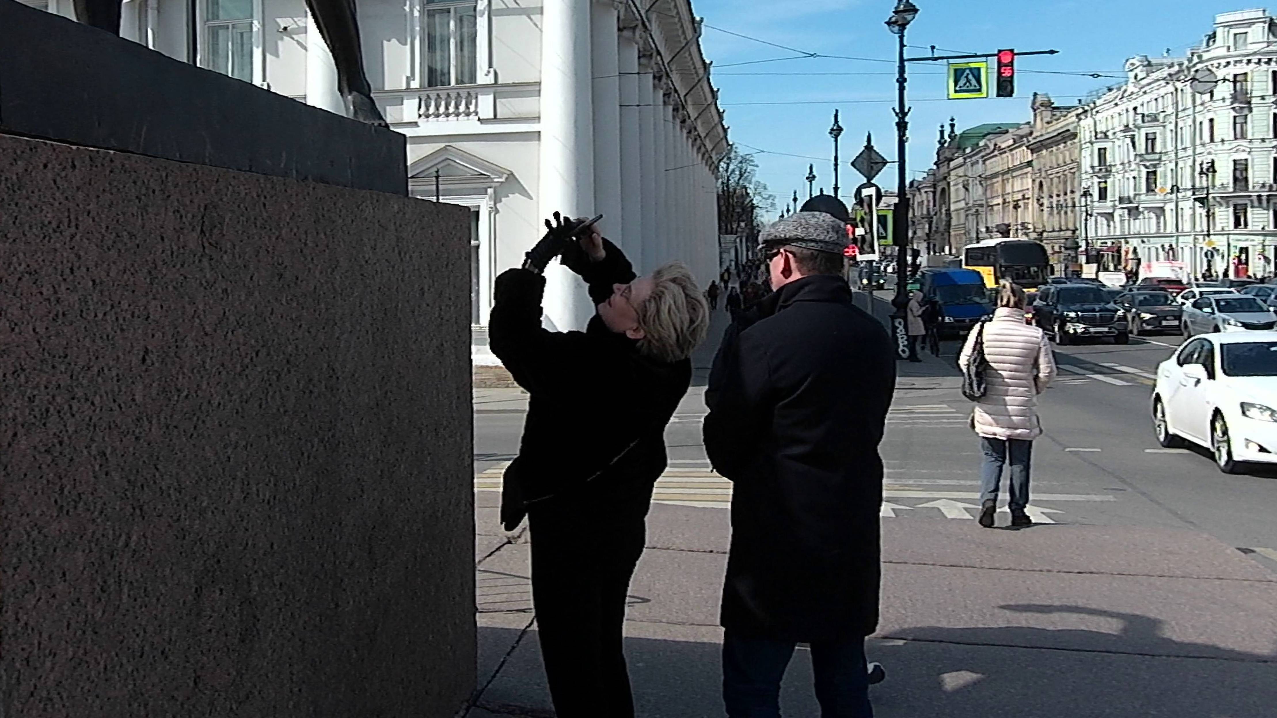 30 апреля 2021. СПб, Центральный район. Теледоктор Елена Малышева с охранником фотографирует коней на Аничковом мосту.