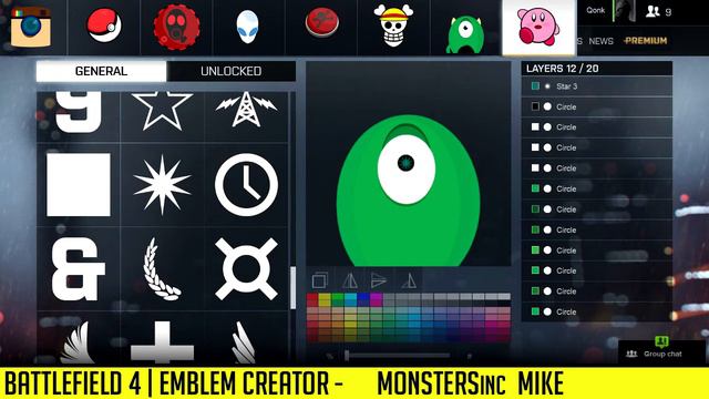 BF4 Emblems | Creator - MONSTERS inc Mike | Qonkey Welcome to my new series "BF4 EMBLEMS" creator / maker where I make amazing Emblems for Battlefield 4. I see no one doing this and me being on a COD background I know the playercards on Blackops were huge and a big deal to everyone. It just seems no one knows or don't care about amazing Battlefield Emblems, well I do and here are some of many I am going to be making. Stay tuned for more content to come! and also if you like the video drop a massive like and comment what you thought and what you wish to come! I am also looking to do team and clan emblems on BF4 so just hit me up on Twitter for any questions. Twitter: https://twitter.com/QONK3Y Check out the amazing Music creator here he makes amazing music that blew my mind. https://soundcloud.com/eductrix https://twitter.com/Eductrix http://www.facebook.com/Eductrix