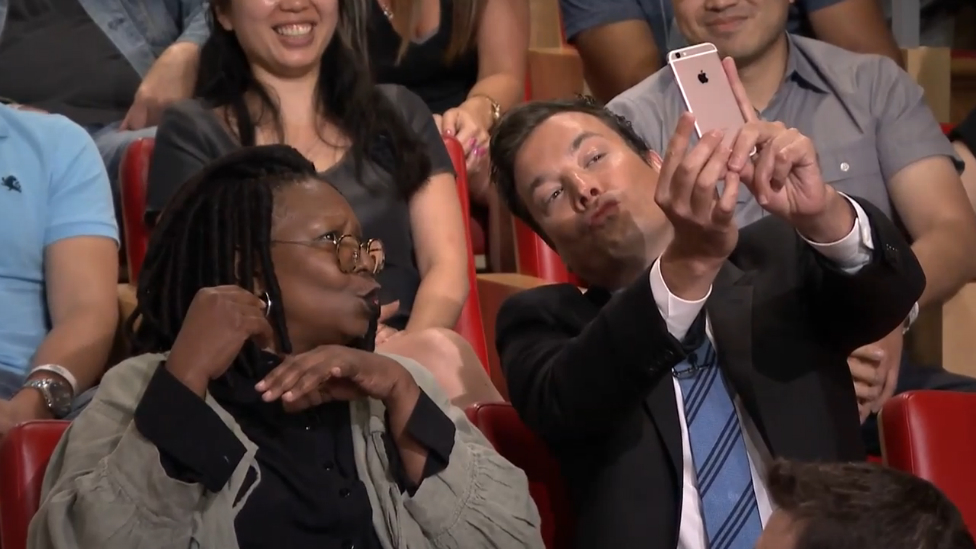 Американская актриса и телеведущая Вупи Голдберг сделала свое первое селфи на съемках шоу «The Tonight Show» Джимми Фэллона. Как оказалось, до этого актриса не только ни разу не фотографировала себя на фронтальную камеру телефона, но и не знала, что значит «дак фейс» — Голдберг думала, что это не выражение лица, а имя и фамилия человека. Джимми Фэллон исправил ситуацию — помог своей гостье сделать селфи и показал, как выглядит «дак фейс».