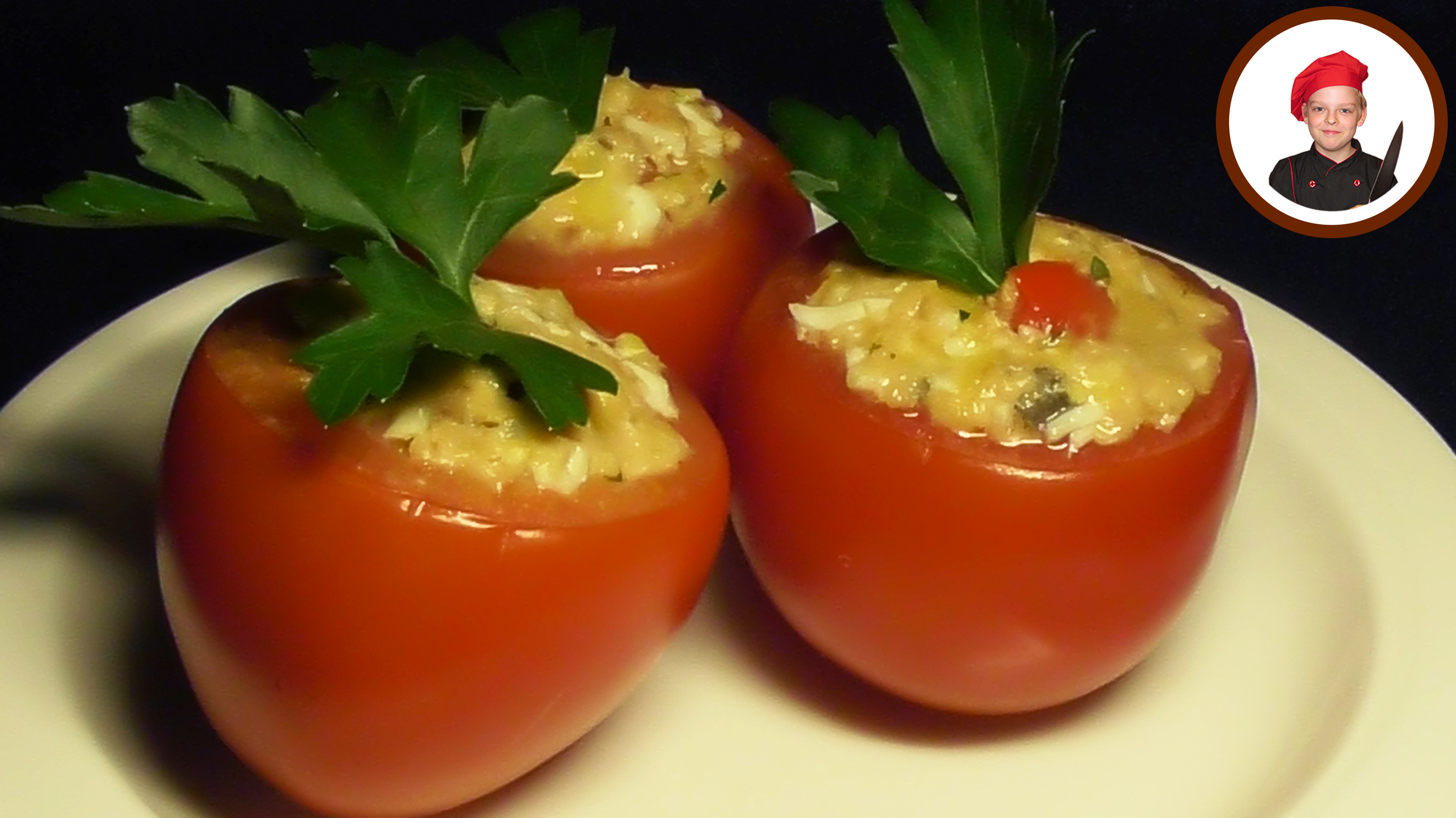Закуска для из помидор Ингредиенты на 4 порции: - Помидоры средних размеров - 4 шт. - Горбуша консервированная - 100 г. - Сыр - 100 г. - Перец сладкий - 1/3 шт. - Яйца куриные - 1 шт. - Петрушка - 1 веточка - Чеснок - 1-2 зубчика - Соль, перец по вкусу #закуска #Рецепт #Апухтин #кулинария