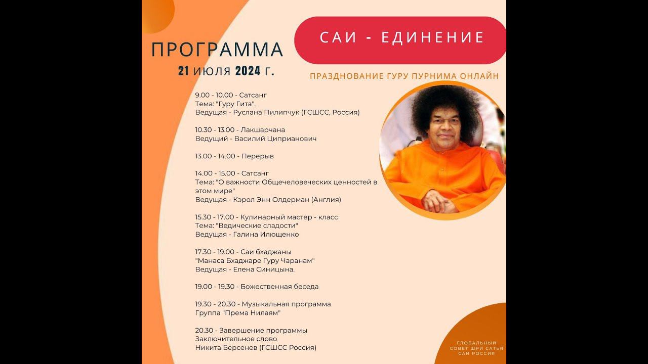 Глобальный Совет Шри Сатья Саи приглашает всех на празднование Гуру Пурнима онлайн, 20 и 21 июля. Тема праздника в этом году: "Саи - Единение". В течение полных двух дней мы будем почитать нашего Садгуру - Бхагавана Шри Сатья Саи Бабу подношением в виде различных программ. Совместно с нашими братьями и сестрами по всему миру мы проведем духовные сатсанги на тему значения Гуру, поиска внутреннего Гуру и связи с Ним, пуджу и Лакшачану, урок по Саи бхаджанам и ведам, а также различные практические мастер-классы (творческий, кулинарный, по йоге) для того, чтобы на практике объединить наши мысли, слова и действия. Мы также предложим Божественным стопам нашего Учителя музыкальные программы. Вершиной празднования будет Божественная беседа - на тему Единства и наставления Бхагавана всем нам, стремящимся быть его преданными. Подписывайтесь на наш каналы и оставайтесь на связи: Телеграм: https://t.me/SSSGCRussia YouTube: https://youtube.com/@sssgcrussia?feature=shared