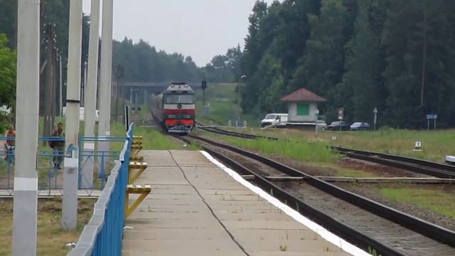 БЧ / РЖД Тепловоз ТЭП70-0369(ТЧ-15 Орша) с поездом №458Ш Херсон-Санкт-Петербург проходит о.п. Полыковские Хутора.Перегон Могилёв-I - Лотва. Скорость 93 км/ч