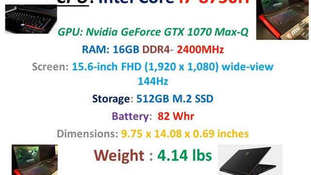 For more Please "subscribe" my channel MSI GS65 Stealth Thin | Intel Core i7-8750H | Nvidia GeForce GTX 1070 Max-Q Gaming laptop Source : https://www.pcgamer.com/best-gaming-laptop/ Sound :To request a commercial license visit: http://ncs.io/Commercial MSI GS65 Stealth Thin Elegant. Portable. Powerful. The best gaming laptop you can buy CPU: Intel Core i7-8750H | GPU: Nvidia GeForce GTX 1070 Max-Q | RAM: 16GB DDR4-2400MHz | Screen: 15.6-inch FHD (1,920 x 1,080) wide-view 144Hz | Storage: 512GB M.2 SSD | Battery: 82 Whr | Dimensions: 9.75 x 14.08 x 0.69 inches | Weight: 4.14 lbs