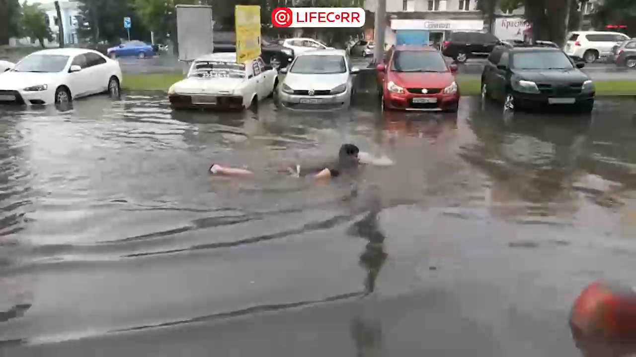 Один из жителей Челябинска переплыл огромную лужу, образовавшуюся на парковке.