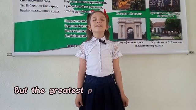 Международный конкурс «Расскажи миру о своей Родине» — проект по патриотическому воспитанию детей и молодёжи и формированию дружественных международных связей между подрастающими поколениями разных стран. «Мне понравилось сниматься и говорить о нашей красивой и любимой Кабардино-Балкарской Республике».