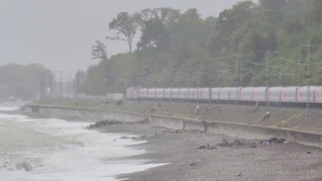 пассажирские поезда и бушующее море около непривычно мокрой пл. Солоники Скв