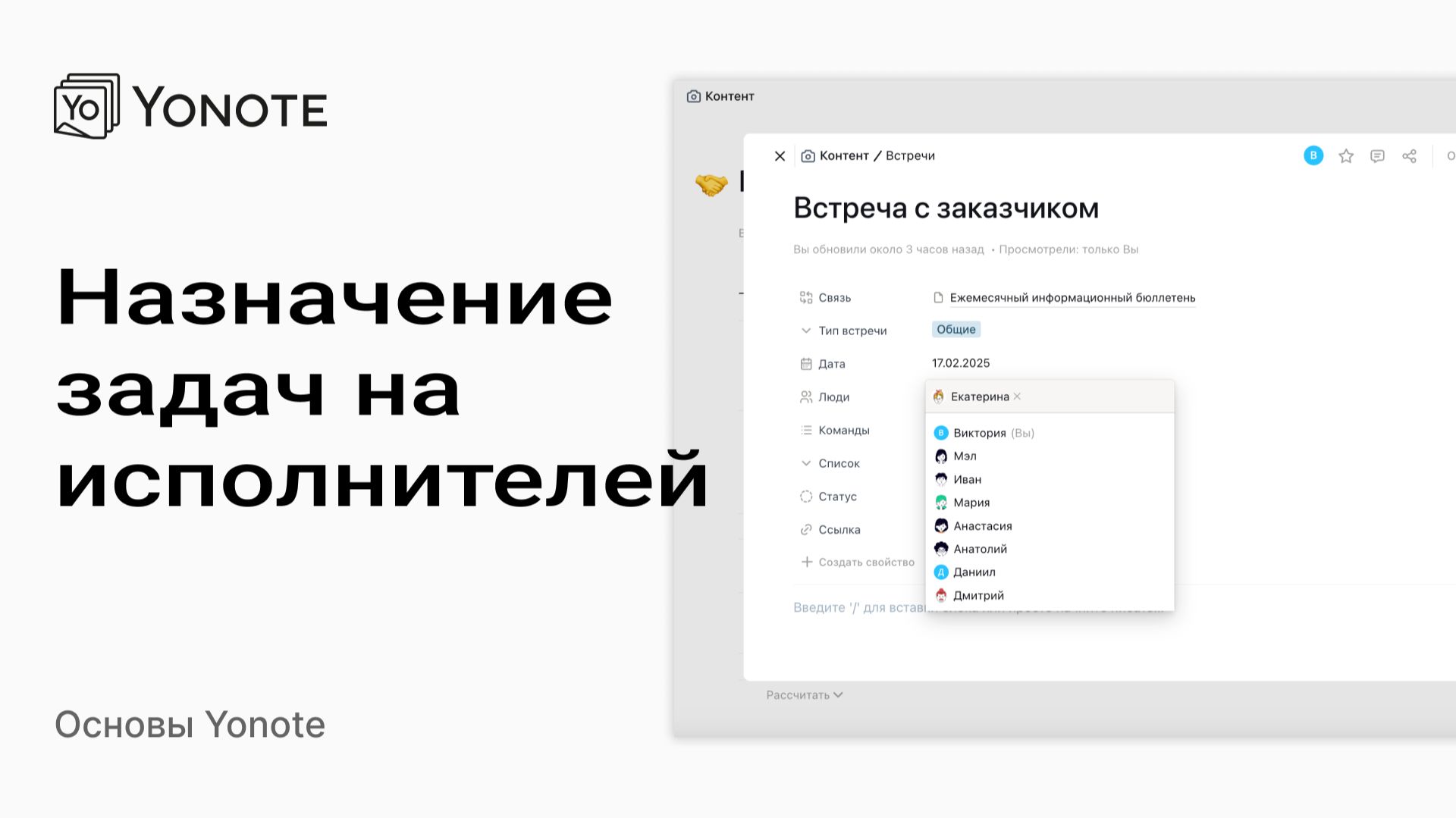 В этом уроке вы узнаете, как распределять задачи среди участников вашей команды и заполнять их данными непосредственно внутри самих задач Мы в ВК: https://vk.com/yonote Мы в ТГ: @yonote Чат с разработчиками: @yonote_chat