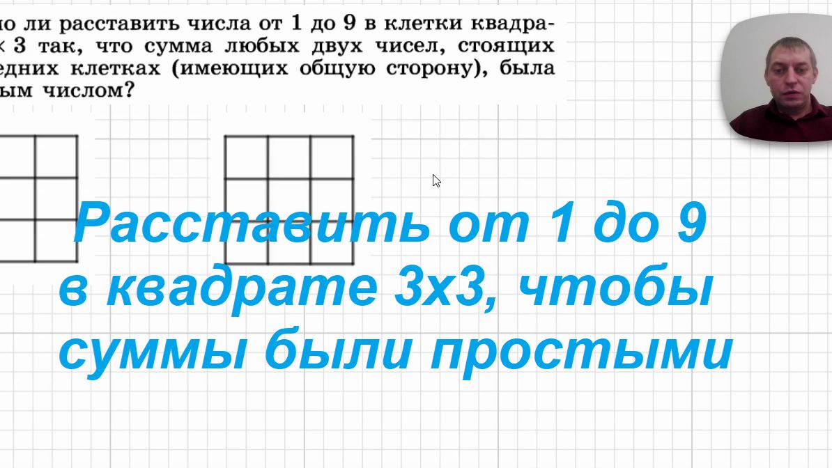 День 55-й. Задача про расстановку чисел в квадрате 3х3, чтобы суммы соседей были простыми. Для понимания решения достаточно логики и умения считать в пределах 20. )