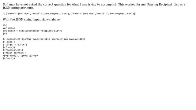Salesforce: Parse JSON string in AMPscript Helpful? Please support me on Patreon: https://www.patreon.com/roelvandepaar With thanks & praise to God, and with thanks to the many people who have made this project possible! | Content (except music & images) licensed under CC BY-SA https://meta.stackexchange.com/help/licensing | Music: https://www.bensound.com/licensing | Images: https://stocksnap.io/license & others | With thanks to user Tim Graf (salesforce.stackexchange.com/users/28257), user Adam Spriggs (salesforce.stackexchange.com/users/5202), and the Stack Exchange Network (salesforce.stackexchange.com/questions/107133). Trademarks are property of their respective owners. Disclaimer: All information is provided "AS IS" without warranty of any kind. You are responsible for your own actions. Please contact me if anything is amiss at Roel D.OT VandePaar A.T gmail.com