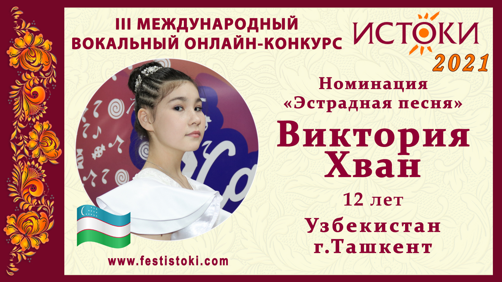 Лауреат III степени III Международного вокального онлайн-конкурса «Истоки». Номинация "Эстрадная песня". Песня "Белые ангелы" (Мечтатели) Авторы Максим Фадеев и Ольга Серябкина. Сайт: www.festistoki.ru / www.festistoki.com E-mail: festistoki@mail.ru