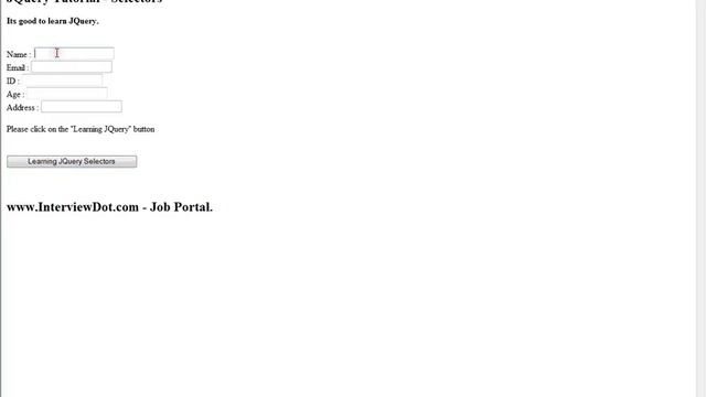 Click here - https://www.youtube.com/channel/UCd0U_xlQxdZynq09knDszXA?sub_confirmation=1 to get notifications. DISABLED SELECTOR IN JQUERY DEMO A Job Portal http://www.InterviewDot.com http://www.InterviewDot.com http://www.InterviewDot.com One Click Dream Job - http://www.interviewdot.com/upload-resume/uploadresume.htm Are you looking for a new Job ? InterviewDot.com - A Job Portal http://www.InterviewDot.com http://www.InterviewDot.com http://www.InterviewDot.com One Click Dream Job - http://www.interviewdot.com/upload-resume/uploadresume.htm FRESHERS core JAVA INTERVIEW QUESTION AND ANSWER EXPERIENCED core JAVA INTERVIEW QUESTION AND ANSWER SPRING FRAMEWORK INTERVIEW QUESTION AND ANSWER HIBERNATE INTERVIEW QUESTION AND ANSWER DESIGN PATTERNS INTERVIEW QUESTION AND ANSWER JQUERY INTERVIEW QUESTION AND ANSWER AJAX INTERVIEW QUESTION AND ANSWER SQL INTERVIEW QUESTION AND ANSWER JUNIT INTERVIEW QUESTION AND ANSWER SOFTWARE ARCHITECTURE INTERVIEW QUESTION AND ANSWER CODE REFACTORING INTERVIEW QUESTION AND ANSWER PERFORMANCE TUNING INTERVIEW QUESTION AND ANSWER JAVA VIRTUAL MACHINE INTERVIEW QUESTION AND ANSWER JQUERY TUTORIAL DISABLED SELECTOR IN JQUERY DEMO