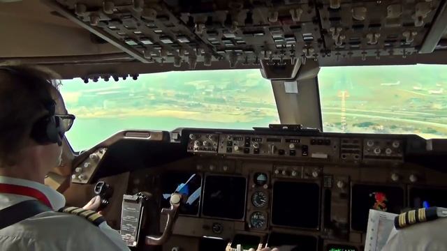 Видео из кабины пилота большого самолета Боинг Boeing 747. Посадка в Гонконг Китай. Красивая посадка