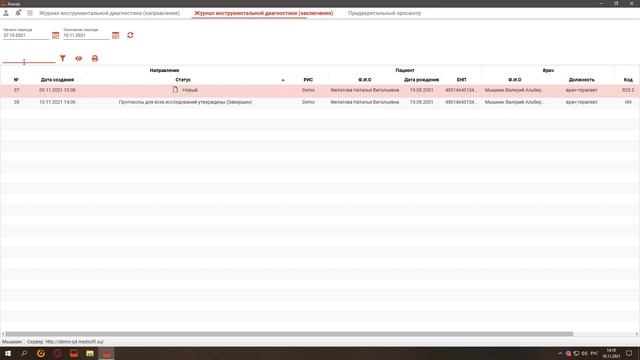 Модули "Журнал инструментальной диагностики. Направления", "Журнал инструментальной диагностики. Заключения", раздел "Диагностика" модуля "ЭМК"