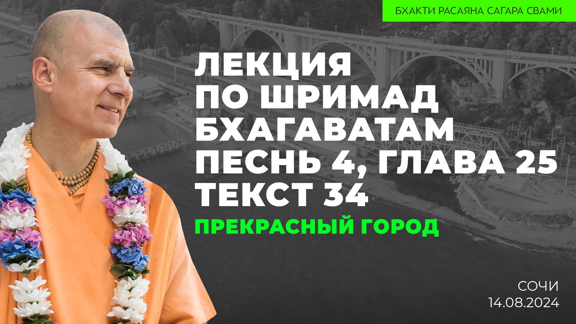 Е.С Бхакти Расаяна Сагара Свами - Лекция по Шримад Бхагаватам 4.25.34 "Прекрасный город" (Сочи 14.08.2024г.) ________________________________________________________________________________________________ Бхакти Расаяна Сагара Свами более 30 лет практикует монашеский уклад жизни в традиции бхакти-йоги, в 2016 году принял санньясу. Преподает и консультирует лидеров общества и бизнеса более чем в 20 странах на 4-х континентах. Использует в своих лекциях и тренингах древние священные писания и современные разработки Гарвардской бизнес-школы. Развивает межконфессиональное сотрудничество на уровне стран и ООН. Выступает духовным лидером российского представительства международного бизнес-форума "Артха". Распространяя духовное знание, совершил 14 полных кругосветных путешествий.