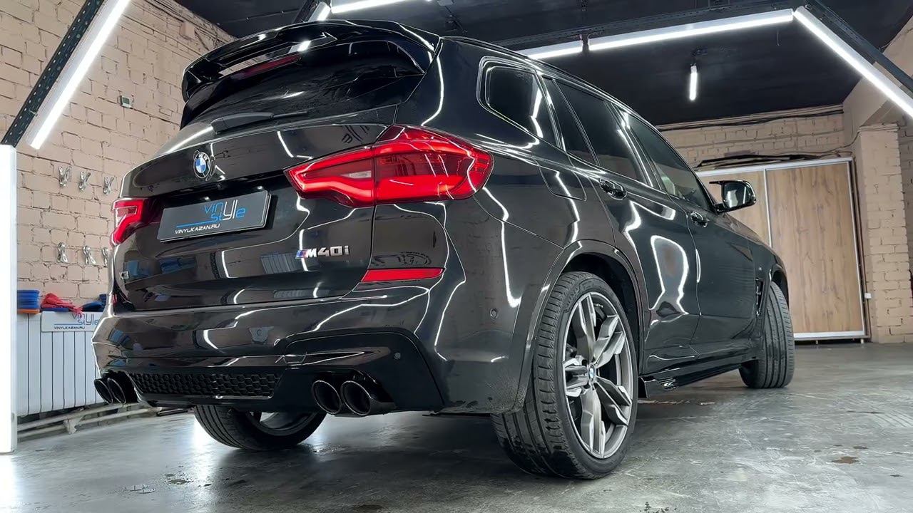 https://vinylkazan.ru BMW X3 M40i Поколдовали над выхлопом, заменили насадки. Установили обвес, предоставленный клиентом. Заменили решётку радиатора, жабры, сплиттер переднего бампера, спойлер, лезвия на порогах, накладки на зеркалах, задний диффузор.