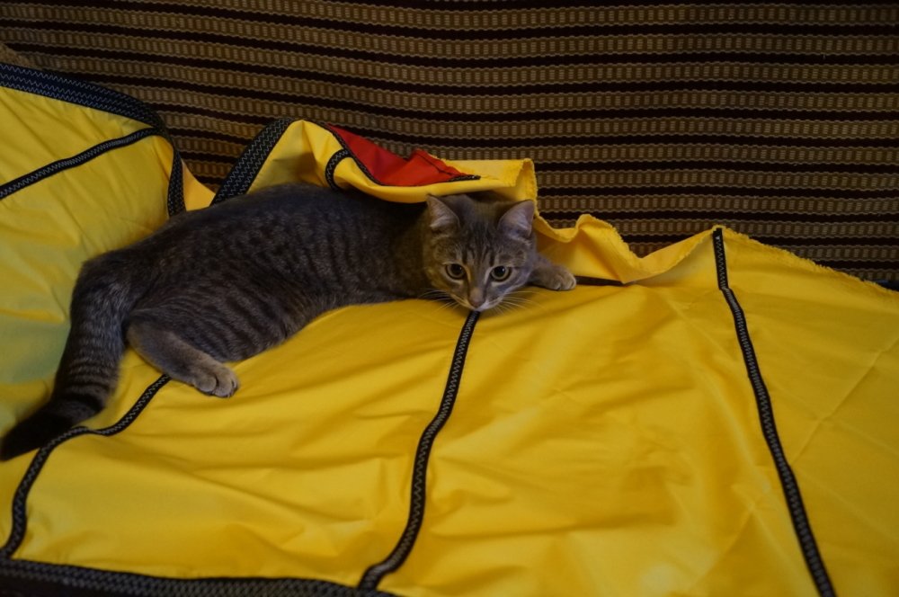 В помощь подвесному парусу, изготовлен стаксель. Что-то вроде штормового стакселя, площадью 1,1 м2. При снаряжении ПВХ малютки, длинной 2,5 м. двумя парусами, получится функциональное и весьма симпатичное плавсредство, почти мини яхточка. Я же, расположившись под этими парусами, легко могу вообразить себя яхтсМЕНом !))