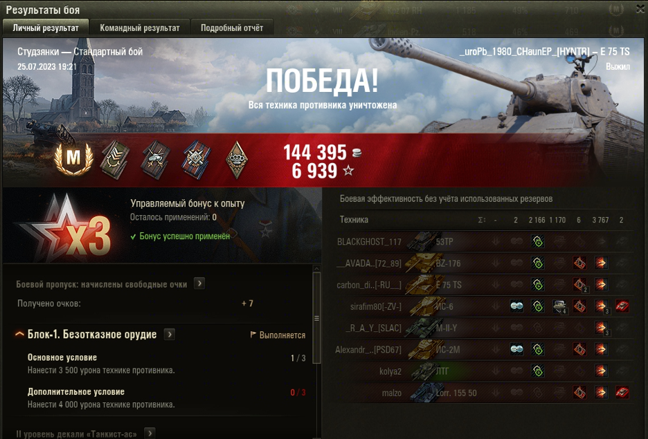 ЭРЛЕНБЕРГ МАСТЕР на E 75 TS ОПЫТ: 1403 СУММАРНЫЙ УРОН: 5856 медаль РАЗВЕДЧИК