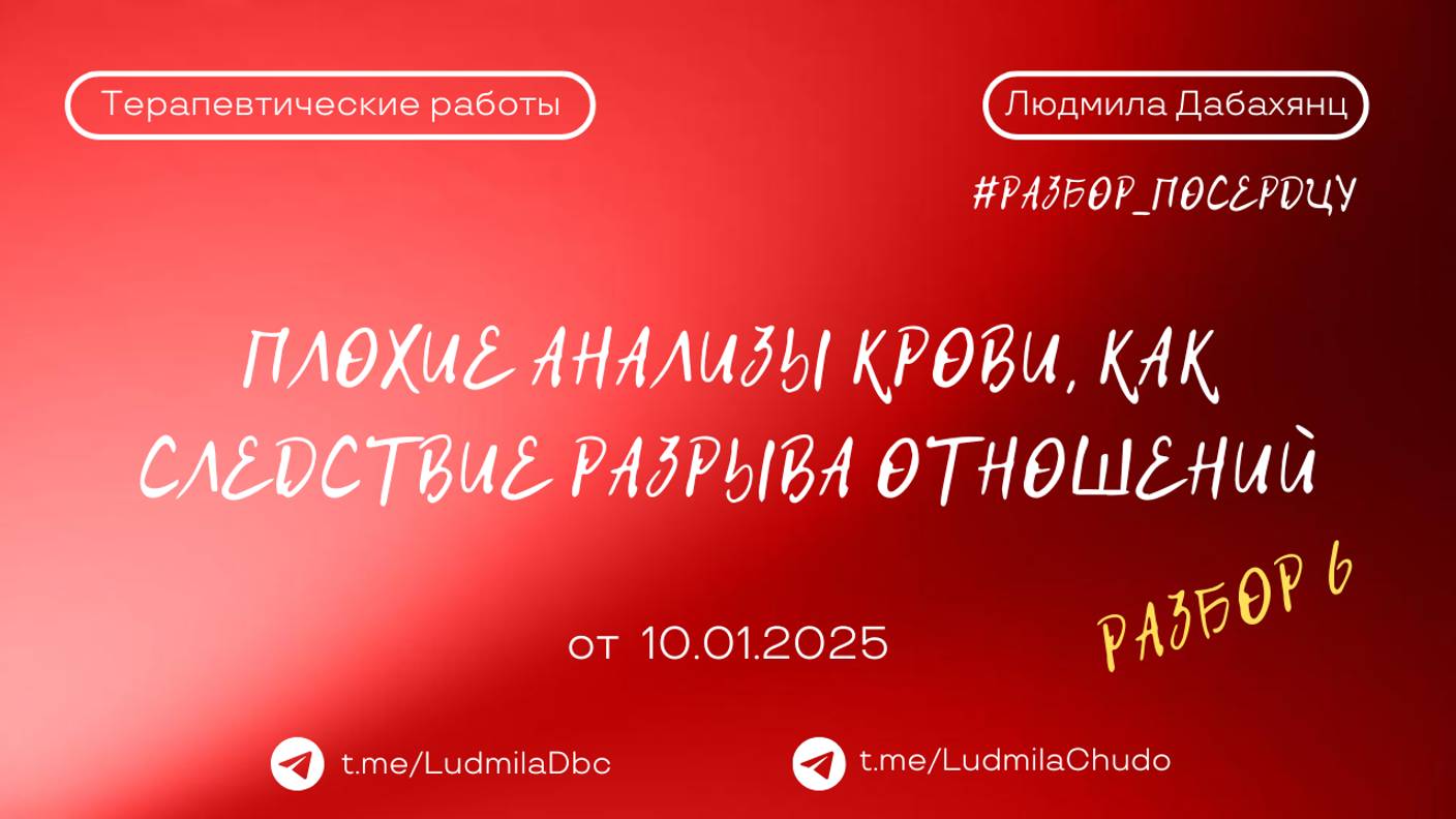 Запись эфира #разбор_поСердцу Плохие анализы крови, как следствие разрыва отношений. 💫Полный эфир здесь: 👉🏻https://rutube.ru/video/71c7b2df652769f5ae52e767b4c4e991/ ‼️ до встречи на следующей неделе, успевайте отправить заявку на участие в разборе, заявки на разбор принимаются здесь - https://t.me/ludmiladbc_bot ‼️ канал #твАрец_реальности 2025 Подробнее: https://rutube.ru/video/2744940f7bab3063b818c926b2253dfc/ О канале: https://t.me/chatLudmilaChudo/4310 Заходите в бот - https://t.me/ludmiladbc_bot , если хотите участвовать Теперь в одном месте ты можешь посмотреть: ✔️ чем я могу быть для тебя и... ✔️ что я могу дать тебе Переходи: https://t.me/ludmiladbc_bot ✓ Обязательно поставь 💗 ✓ Подпишись на канал ✓ И поделись с близкими Это будет вашим балансом за движение и получение энергии. Если есть желание создать баланс брать-давать... приму от всего сердца с благословением (донейшн). С Огромной Любовью, Дабахянц Людмила 💓 ✨ Telegram: https://t.me/ludmiladbc ✨ Канал в telegram “Я ЕСТЬ”: https://t.me/LudmilaChudo ✨Мой бот в telegram: https://t.me/ludmiladbc_bot ✨Онлайн-школа: https://ludmilachudo.skillspace.ru/school ✨Rutube: https://rutube.ru/channel/34371568/