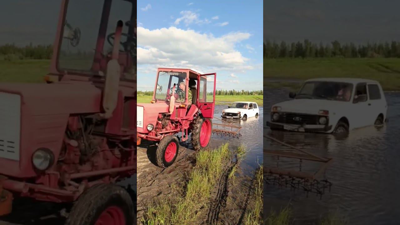 вытаскиваю Ниву из воды трактором т25