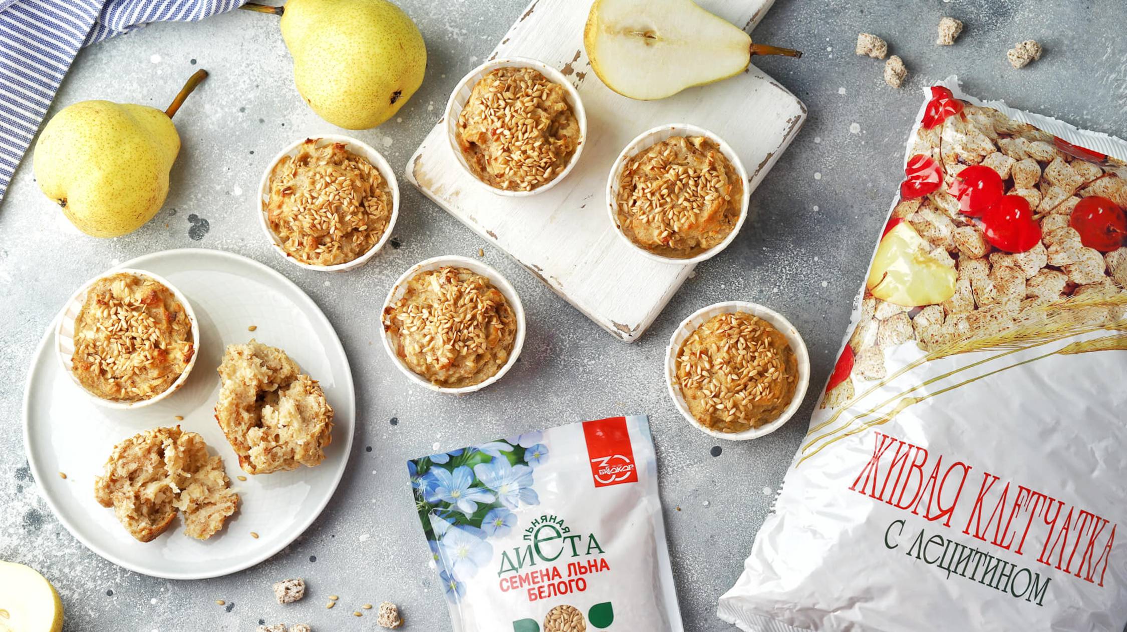 Грушевые кексы с цельнозерновым продуктом "Живая клетчатка" Биокор и семенами льна "Биокор"
