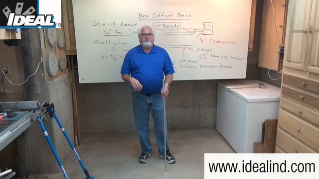 Here is the link to the IDEAL Conduit Bender product page. https://www.idealind.com/us/en/shop/product-type/fishing-bending-lubes/benders.html Electrician's use a Box Offset bend anytime they need to feed an electrical box with conduit. it is one of the more basic bend they make just about every day of the week. I'll step you though how to make one. In this video I will show you one way to make a Box Offset Bend in a ½ inch EMT conduit using a hand conduit bender from IDEAL. A Box Offset Bend is needed anytime an electrician needs to feed an electrical box with a piece of conduit. The knockout on the electrical box is not flush with the back of the box hence the conduit must be bent slightly so it can be inserted into the conduit fitting attached to the box. This allows the conduit to be mounted properly to the wall without putting undue stress on the conduit fitting. For this demonstration I will use our catalog number 74 – 026 Ductile iron head bender from IDEAL. The ductile iron head benders are typically preferred by the professionals as they will last longer than aluminum bender heads which are lighter weight but less durable. Generally a 10° offset Bend is used to create this box offset. If you remember my video on offset bends a certain shrink amount and a multiplier is used to create the offset. On 10° offset bends the shrink amount is 1/16 of an inch for every inch of obstruction and the multiplier is six which is used to calculate the distance between the two bends I need to make. On a typical electrical box the knockout is about 3/8 of an inch away from the back of the box which becomes the height of the obstruction we need to overcome. Six times 3/8” is 2 ¼” which becomes the distance between the two bends on the conduit I will make. The shrink amount is so small it is not a factor. To make the box offset on the end of a piece of conduit I will make two marks. Step one is to make the 1st mark at about 2 ½ inches from the end of the conduit. If I make the mark any closer to the end of the conduit the hook of the bender head may deform the round shape of the end of the conduit and not fit inside the conduit fitting on the box. Contractors generally use a pencil to mark the conduit so it can be erased later. In my example I will use a permanent marker and mark the conduit all the way around so the mark will not get lost in the conduit head when bending. For the 3/8” offset we calculated the distance between bends to be 2 ¼ inches. So I’ll make a second mark 2 ¼” away from the first mark and mark the conduit all the way around. Offset bends are done in the air not on the ground. Simply stand the bender with the handle pointing down and bender head closer to you. Step two is to insert the conduit into the bender head and lineup the first mark with the arrow on the bender head. Bend your knees to lower your center of gravity and place 1 foot up against the bender handle to keep it from slipping. Then using constant pressure close to the bender head, bend the conduit to the 10° mark. The bottom of the conduit will be even with the mark. Step three is to slide the conduit down to the second mark and line it up with the arrow on the bender head. Rotate the conduit 180° and align the first bend with the second bend sighting down the bender handle. Then bend the conduit to 10° again. This creates the box offset in the conduit that allows it to easily slide into the conduit fitting on the box. Knowing how to make a box offset bend quickly and efficiently will make those jobs run that much smoother and add value to what you can do. Electricians don’t bend the conduit and then cut it to the correct length. Once they know how to use a bender correctly the conduit is the correct length for the job. Using a good quality hand conduit bender like this one from IDEAL will provide accurate and professional looking bends that electricians expect while on the job. If you want to learn more about the line of hand conduit benders from IDEAL. Please visit our website or contact our customer service department to find a local distributor. Thanks for watching folks I’m Ron with IDEAL and see you on the next one. #RonKipperFromIDEAL #IDEALINDUSTRIES #IDEALConduitBenders