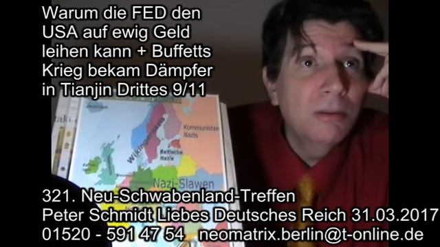 Warum die private FED den USA auf ewig US-Dollar leihen kann Zins auf Geld ist Feind aller Menschen, Peter Schmidt, 29. März 2017 Im Alten Testament verbot Moses Zins + Wucher auf Geld + Nahrung 2. Mose 22:25, 3. Mose 25:36-37, 5. Mose 23:19. Gottfried Feder klärte mit „Brecht die Zinsknechtschaft“ 1919 auf. Adolf Hitler erwähnte Feder im Buch „Mein Kampf“ 1925 a.d. Seiten 232-234. 1913 installierte der US-Kongress die Bundesbank FED, die von den zehn größten privaten Bankhäusern gehalten wird. Der demokratische Präsident Woodrow Wilson unterzeichnete am 23. Dezember 1913 im Weißen Haus den „Federal Reserve Act". Wahrscheinlich deshalb kam sein Bild als Belohnung auf die größte US-Banknote, den 100.000 USD Schein. Wilson war aber unglücklich damit, denn er bekannte, daß er sein Land unwillentlich ruiniert hatte, in dem er das Volk an die Banker auslieferte. Wieso kann die private FED den USA auf ewig US-Dollar leihen? Weil das Geld kostet fast nichts, außer ein paar Cent für den Papier-Druck oder einen Return-Tasten Druck am Computer bzw. einen simplen Eintrag ins (Konto-)Buch. Was verlieren die FED Banker bei einem 100-US-Dollar-Schein mit Benjamin Franklin Aufdruck, wenn die Bank ihn nicht wiederkriegt? Verlieren sie 100 US-$? Sie verlieren etwa 5 US-Cent, denn das hat der Papierdruck der 100-Dollar-Note gekostet. Sie kreieren aus 0,05 Dollar Druckkosten den 2000-fachen Wert von 100-US-Dollar-Papiergeld. Das nenne ich eine sehr teure, völlig überbezahlte aber sehr kleine Tapete. Der Fall der First National Bank of Montgomery gegen Jerome Daly wegen Kredit- Rückzahlung, offenbart, daß Banken beim Erschaffen vom Kredit noch nicht einmal Druckkosten für Geldscheine haben. Jerome Daly durfte mit Urteil vom 9. Dezember 1968 von Friedensrichter Martin V. Mahoney in Credit River Township, Scott County, Minnesota, sein Haus behalten und brauchte auch keine 14.000 US-Dollar an die klagende Bank zurückzahlen, weil der Kläger – vertreten durch den Präsidenten der Bank, Mr. Lawrence V. Morgan – zugab, zusammen mit der FED, Geld & Kredite in den Büchern durch Buchungsposten zu erschaffen. Geld & Kredit beginnen erst beim Erschaffen in den Büchern zu existieren. Mr. Morgan gab zu, daß es kein Gesetz gibt, das ihm das Recht gibt, das zu tun. Wegen dieser Offenbarung wies das Gericht die Klage der Bank zur Zwangspfändung zurück, und Jerome Daly behielt sein Haus [1]. Die Einführung der FED wurde von Banker damit begründet, daß dann die Börse sicher sei, und sogenannte Börsen-Crashs, die es zuvor gab, wie „Die Panik von 1901“, 1906, 1907, nicht mehr vorkommen würden. Ein Crash erlebt nur der, der seine Aktien an einen anderen billiger verkauft. Die (informierten) Aufkäufer sind die Gewinner. Crash + Panik wird an den Börsen von denen gemacht, die im Club der Gewinner Mitglied sind. Und dazu gehört der normale (Verlierer) Bankkunde eher nicht. Alle sogenannten Börsen-Zusammenbrüche sind gemacht, genau wie False-Flag- Terroristen, RAF tötet Alfred Herrhausen [2], damit Reiche gegen Arme gewinnen [3]. Quellen Hinweise . [1] Jerome Daly Urteil vom 09.12.1968 https://mn.gov/law-library/assets/1968-12-09judgmentanddecree_tcm1041-115904.pdf siehe Zeitgeist Addendum, 2008, Teil 2/13 https://www.youtube.com/watch?v=Cw0086V5cCY [2] Das RAF-Phantom - Wozu Politik und Wirtschaft Terroristen brauchen, Gerhard Wisnewski, Wolfgang Landgraeber, Ekkehard Sieker ,1992, Droemer Knaur-Verlag. [3] Warren Buffett erklärt 99,99% der Weltbevölkerung den Krieg, den er gewinnen will! (Georg Schramm, 3sat) https://www.youtube.com/watch?v=U46bbmFaq74 Warren Buffet Original ”There’s class warfare, all right, but it’s my class, the rich class, that’s making war, and we’re winning.” Interview New York Times 26. November 2006: In Class Warfare, Guess Which Class Is Winning By BEN STEIN NOV. 26, 2006 http://www.nytimes.com/2006/11/26/business/yourmoney/26every.html?_r=0 FED kann den USA ewig Geld leihen Buffetts Krieg gegen Arme bekam in Tianjin ein 911 Dämpfer 321. Neu-Schwabenland-Treffen Liebes Deutsches Reich im 15. Jahr Freitag 31. März 2017 19.00 Uhr Es ist ein Geschenk des Lebens, in Deutschland geboren zu sein. Wir Glücklichen, wir leben im Heiligen Land. Ich wünschen allen Glückshormone. Ich bin gesund. Gott Danke. Thor Danke. Wotan Danke. Peter Schmidt, Kramstaweg 23, 14163 Berlin, den 31. März 2017 D2-Funk-Fon 01520 – 591 47 54 E-Post neomatrix.berlin@t-online.de Videos http://www.youtube.com/channel/UCnYohtqc5f_2kkAG4BeXwUw Artikel http://www.flickr.com/photos/peter-schmidt-berlin-zehlendorf/ Peter Schmidt Termine https://peter-schmidt-berlin-zehlendorf.jimdo.com/termine/ . P.S. Zur Tianjin-Katastrophe 12.08.2015 Peter Schmidt Neues Drittes 911 UFO-Deutsche gegen Hochfinanz 310. Neuschwabenlandtreffen 21.08.2015 https://www.youtube.com/watch?v=_N2NnalvnGo . Zu Judy Woods Dust Staub Where Did the Towers Go? Molekular-Waffe Karl Nowaks gegen USA 911 317. Treffen https://www.youtube.com/watch?v=Z6_y1QdIr-g