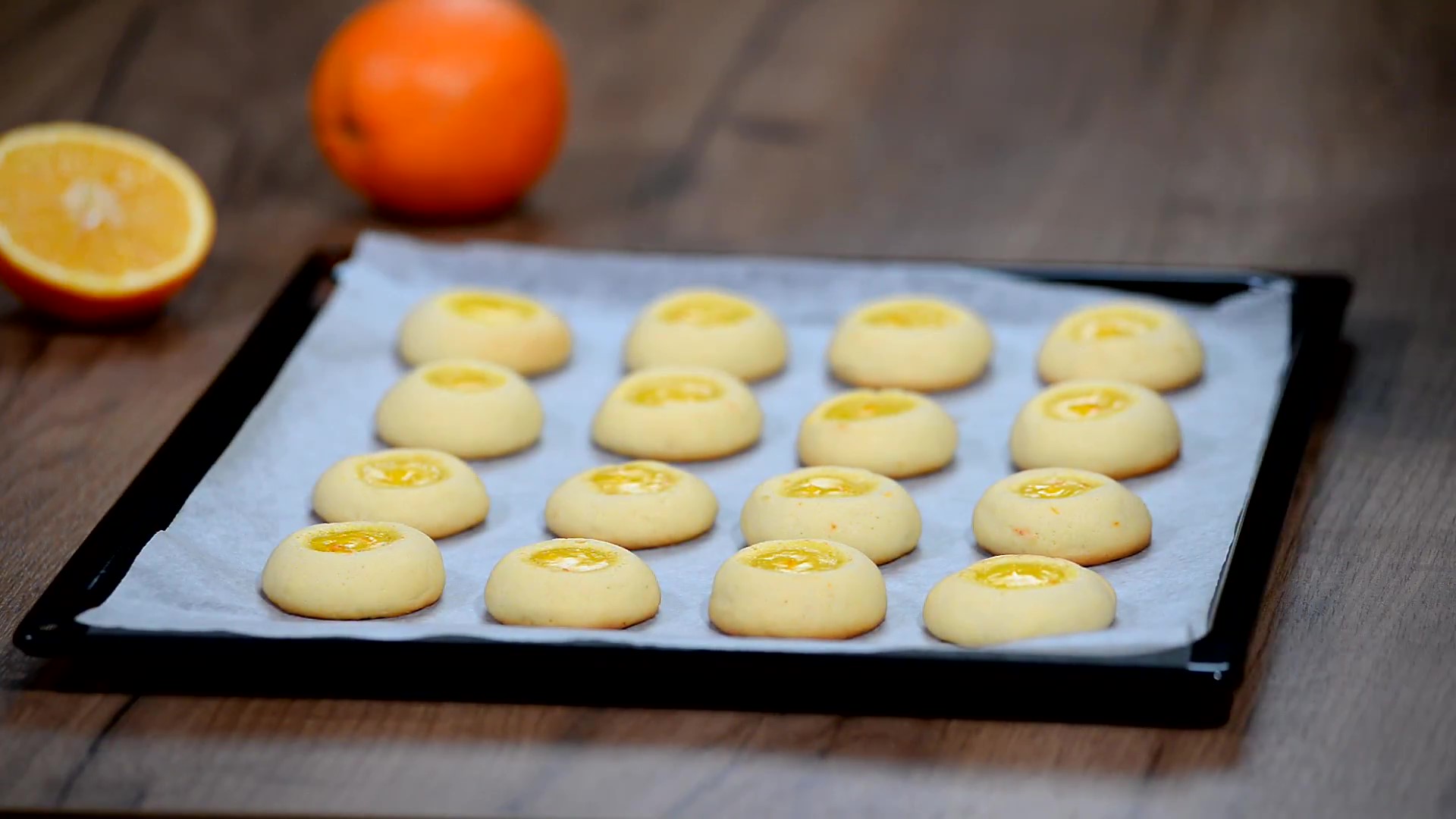 Ингредиенты: Сливочное масло — 180 г. Сахарная пудра — 100 г. Яйцо — 1 шт. Мука — 300 г. Разрыхлитель — 7 г. Ванильный экстракт — 1 ч.л. Апельсиновый сок — 1 ст.л. Цедра одного апельсина Для начинки: Апельсиновый курд — 100 г. • Апельсиновый курд — «Видео как делать апельсиновый курд, есть на канале» Все ингредиенты должны быть комнатной температуры. 1. В миске взбить миксером сливочное масло с сахарной пудрой в течение 2 минут. Добавить ванильный экстракт, апельсиновый сок, цедру апельсина и яйцо, взбить всё до однородной массы. В полученную массу добавить муку и разрыхлитель, замесить мягкое тесто. 2. Накрыть миску с тестом полиэтиленовой плёнкой и убрать в холодильник на 2 часа. 3. Разогреть духовку до 180 °С. 4. Достать тесто из холодильника, и скатать небольшие шарики «с грецкий орех». Выложить на противень застеленный пергаментной бумагой.В каждом шарике сделать углубление в центре для начинки. Заполнить углубление апельсиновым курдом. 5. Выпекать в разогретой духовке 12-15 минут. 6. Вынуть печенье из духовки и дать остыть.
