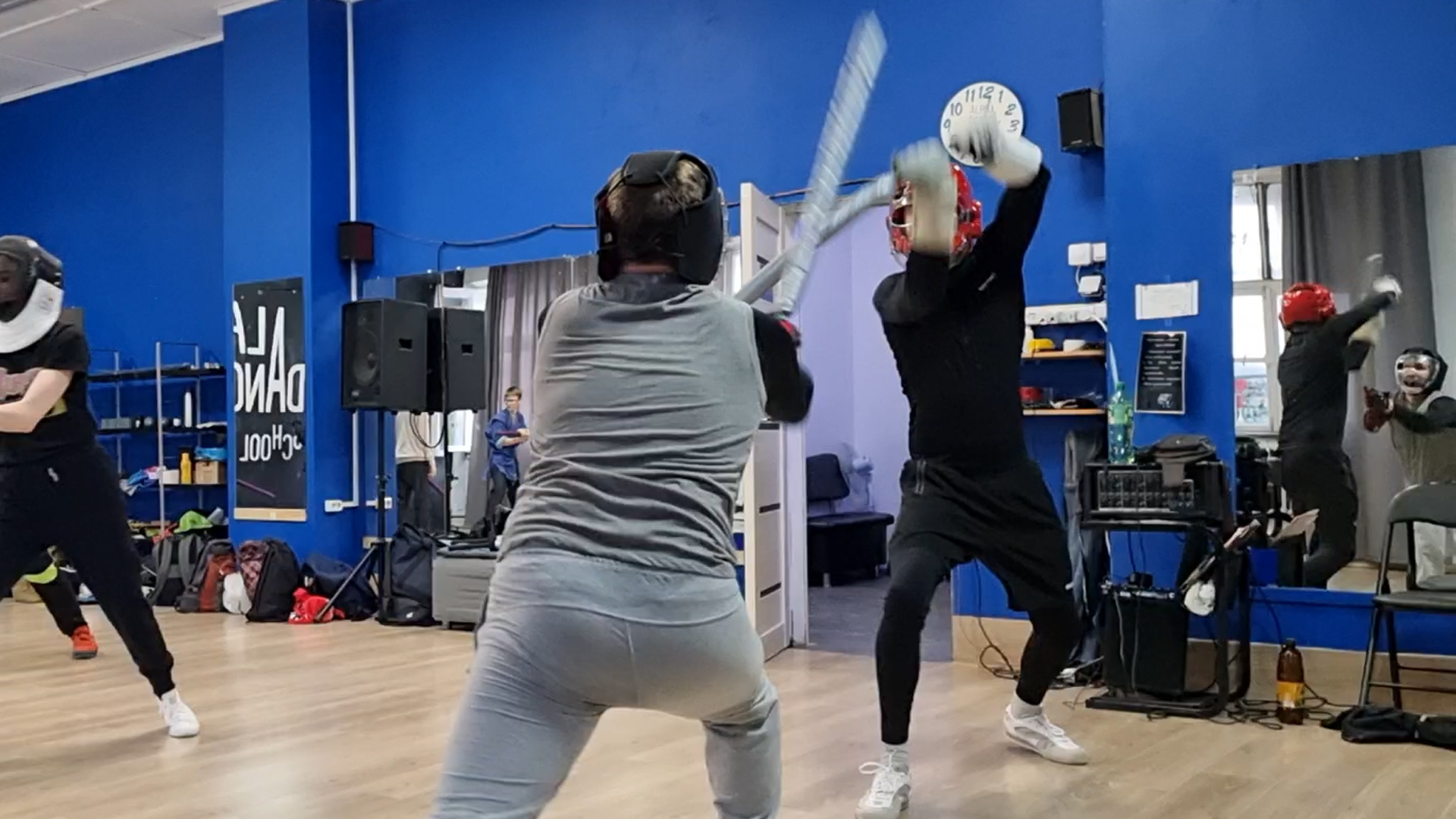 Кендзюцу - японское фехтование: спарринг на длинных мечах на тренировке в Katana Club