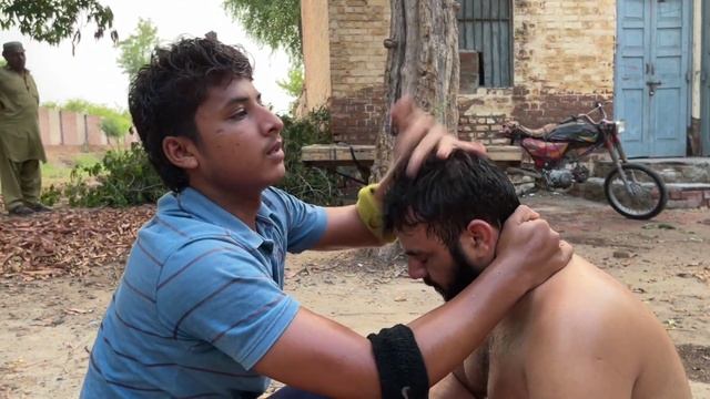 Молодой пакистанский парикмахер Али делает массаж спины и головы