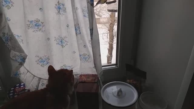 Повесили за окном кормушку, теперь там с утра дотемна синичья карусель. Синицы гроздьями виснут на кормушке, а кот внимательно смотрит эти "мультики" даже "с цензурой" - через занавеску, которую мы задергиваем, чтобы не пугать птиц.