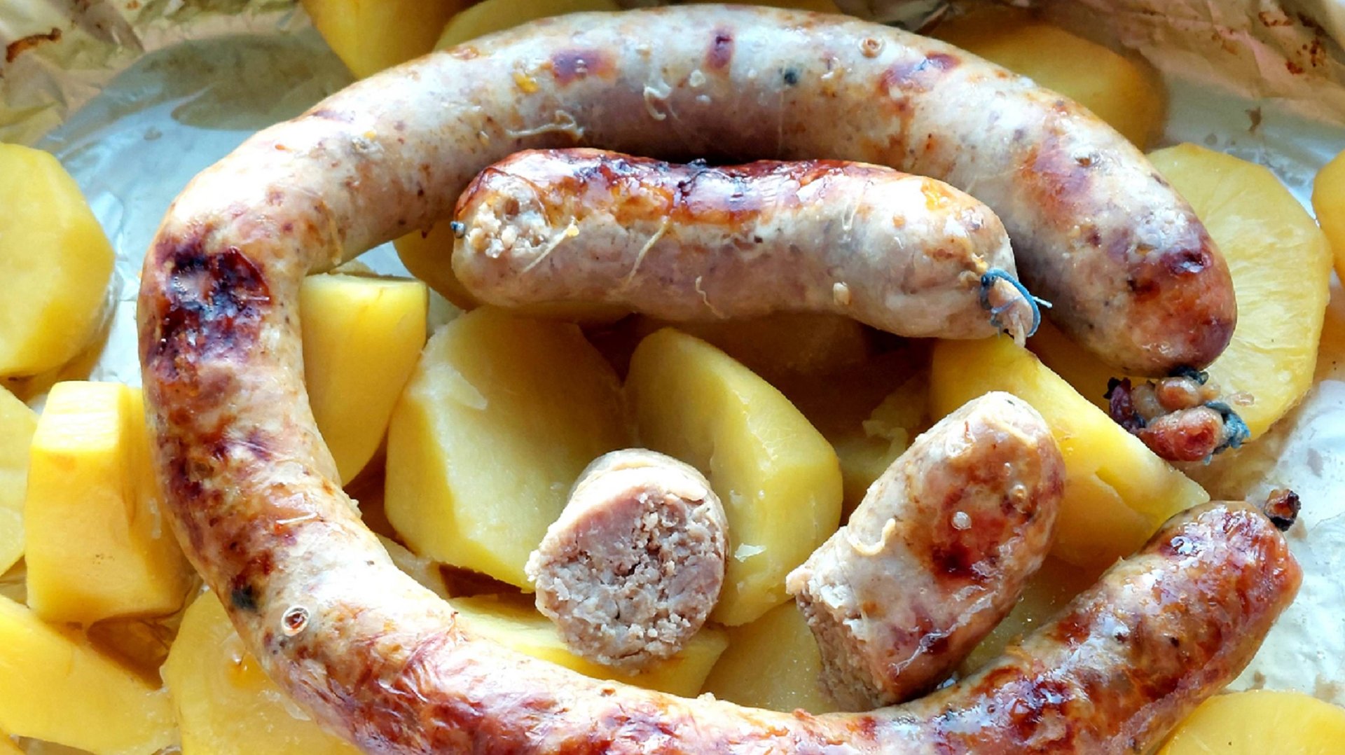 Всем мира, бодрости духа и благополучия. Домашняя колбаса приготовлена из кусочков свинины и фарша. Процесс приготовления начинается с подготовки кишок, разделки мяса, формирования колбасы и заканчивается запеканием колбасы в духовке. ИНГРЕДИЕНТЫ: • Кишки (черева) свиные – 5 м Для фарша колбасного: • Свинина – 2400 гр • Соль – 2,5 чл • Приправа для свинины – 1 чл • Базилик – 0,5 чл • Зира – ¼ чл • Хмели – сунели – 1 чл • Смесь перцев молотая – 1 чл • Сумах – 0,5 чл • Лук – 3 шт • Чеснок – 6 зуб Для запекания: • Картошка – 10 шт • Соль – 0,5 чл • Масло растительное – 2 ст Кишки замочить. Промыть. Для колбасного фарша: подготовленное мясо разделить на две части. Одну часть нарезать небольшими кусочками, другую перекрутить на мясорубке. Перекрученное мясо перемешать с соль и приправами. Добавить кусочки мясо и ещё раз вымешать. Налить в фарш 450 мл воды, перемешать. Объём воды зависит от качества мяса. Фарш должен быть нежным, не плотным. Для формирования колбасы: кишку надеть на специальную насадку для колбасы. Свободный конец завязать. Начало кишки проткнуть зубочисткой. Включить мясорубку. Наполнить кишку фаршем. Фарш в кишку набивается не плотно. Свободный конец кишки завязать. Равномерно распределить фарш в кишке. Когда колбаса будет готова, по желанию, поделить её на порции. Часть отправить в морозилку, часть приготовить в духовке, например, с картошкой. Для запекания в духовке колбасу проколоть в нескольких местах зубочисткой. Отварить до полуготовности картофель. В форму для запекания налить растительное масло, распределить картофель, сверху положить колбасу. Духовку разогреть до 180 градусов и запекать при этой температуре 30 минут, в режиме «верх – низ», на среднем уровне. Далее температуру увеличить до 200 градусов и запекать ещё 10 минут. Время запекания определять, ориентируясь на свою духовку. Подавать в горячем виде. Колбаса хороша и в холодном виде. Подходит для запекания на гриле, костре. ПРИЯТНОГО АППЕТИТА!!!