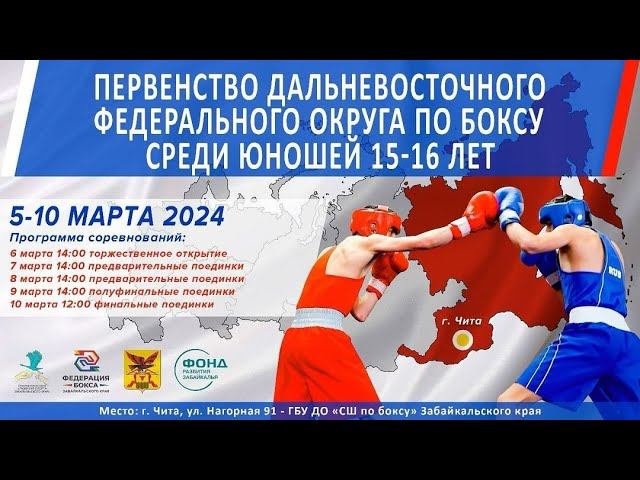 05.03.24 - 10.03.24 10.03.24 - ПЕРВЕНСТВО ДФО ПО БОКСУ СРЕДИ ЮНОШЕЙ 15-16 ЛЕТ Г. ЧИТА ДЕНЬ 5 - ФИНАЛЬНЫЕ БОИ 12:00 (+ 6 МСК) РЕГЛАМЕНТ: https://drive.google.com/file/d/1EREA-swE375sHcg0jR0csUi7uf2Lsk1M/view?usp=sharing