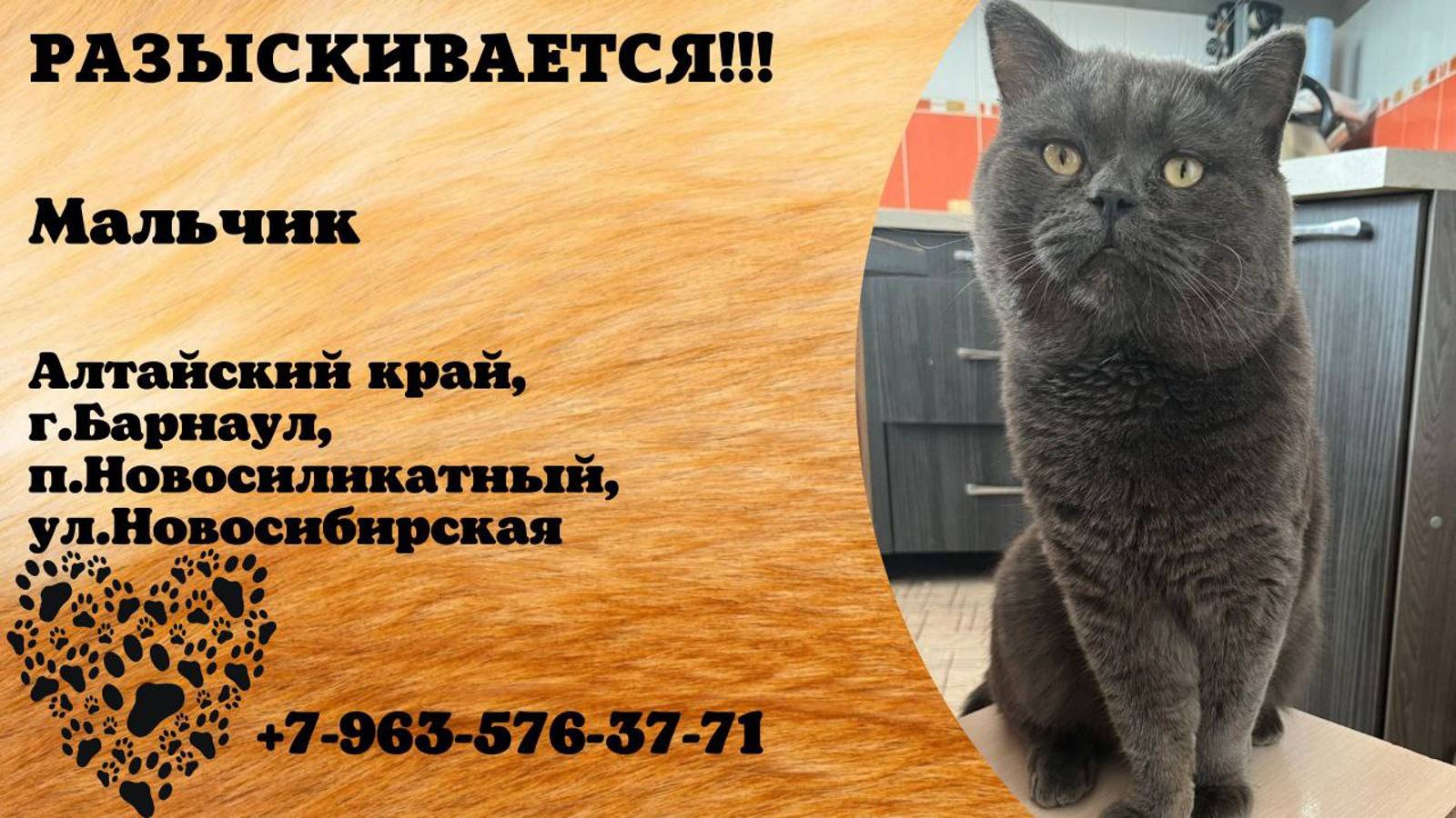 Пропал кот! Мальчик. Алтайский край, г.Барнаул, п. Новосиликатный