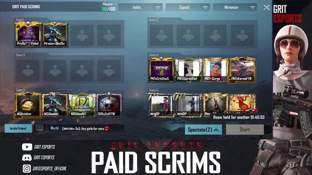 🇮🇳 3-4PM SLOTLIST GRIT ESPORTS PAID SCRIMS 🇮🇳 🧡PLATFORM - BGMI🧡 🗓️DATE - EVERYDAY .................................................................... TYPE - SQUAD:TPP ENTRY FEES - ₹20 #1 : Rs.150 #2 : Rs.100 #3 : Rs.50 #4 : Rs.30 #5 : FREE SLOT MATCHES: 2 DATE - 26/08/2021 MAP 1 MATCH - ERANGEL🤗 MAP 2 MATCH - MIRAMAR🤗 ID PASS - 2:45PM AND 3:45PM STARTING TIME - 3:00 PM AND 4:00PM SLOT LIST 02) 🇮🇳 🔒 03) 🇮🇳 🔒 04) 🇮🇳 PANTHEON 05) 🇮🇳 NGU 06) 🇮🇳 R4G 07) 🇮🇳 CAT ESPORTS 08) 🇮🇳 DOTS 09) 🇮🇳 4KING GIRLS 10) 🇮🇳 RAZE 11) 🇮🇳 DACxOFFCIAL 12) 🇮🇳 NSD 13) 🇮🇳 HADz 14) 🇮🇳 FALLEN DEVILs 15) 🇮🇳 LEX 16) 🇮🇳 BENGALURU 17) 🇮🇳 ACTION 18) 🇮🇳 4MONK 19) 🇮🇳 R9 20) 🇮🇳 ASTRO 21) 🇮🇳 24x7 ESPORTS 22) 🇮🇳 BLUEARMY 23) 🇮🇳 S8UL 24) 🇮🇳 ARONAI 25) 🇮🇳 CHICKEN LOVERS RESULTS WILL BE BASED ON POINT TABLE --------------- 🖤20 SQUADS🖤 ---------------