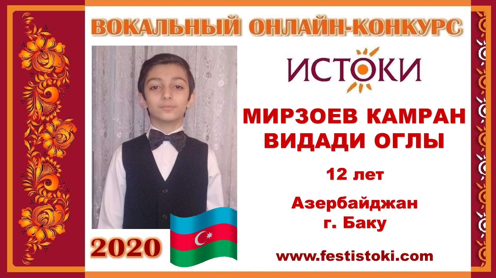 МИРЗОЕВ КАМРАН ВИДАДИ ОГЛЫ, 12 лет (Азербайджан, г. Баку). "Подмосковные вечера"