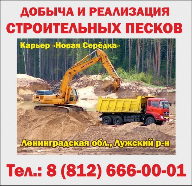 ООО "Карьер "Новая Серёдка": добыча и реализация строительных песков в Лужском районе Ленинградской области. ООО "Карьер "Новая Серёдка" ведёт добычу и реализует СТРОИТЕЛЬНЫЙ ПЕСОК и ПЕСЧАНО-ГРАВИЙНЫЙ МАТЕРИАЛ различных фракций, в соответствии с лицензией на пользование недрами ЛОД 47762 ТР от 19.07.2018 года. Отгрузка проводится круглосуточно. Доставка по Санкт-Петербургу, Лужскому и Гатчинскому районам. Сотрудничаем с юридическими и физическими лицами. Предприятие расположено в 14 км от города Луга, поворот на 161 км Киевского шоссе в направлении деревни Новая Серёдка, в 2 км от трассы. Местоположение на карте: www.stqr.ru/18801-1-166 Ленинградская область, Лужский район, г. Луга Тел.: 8 (812) 666-00-01 В Интернете (в поисковиках) нас находят, в частности, по таким словам: строительный песок Луга, карьер Луга, песчаный карьер Луга, песчано-гравийная смесь Луга. #строительныйпесок #Луга #карьер #Лужскийрайон #песчаныйкарьер #Гатчинскийрайон #СанктПетербург #Ленинградскаяобласть