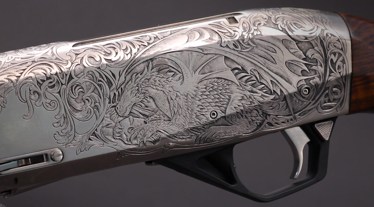 Самое популярное самозарядное охотничье ружье в оригинальном исполнении. Мы продолжаем серию публикаций о высокохудожественном оружии, сегодня на очереди МР-155 «Последний Дракон». Длина ствола - 750 мм. Калибр - 12х76 мм. Обронная и линейная гравировки с последующей растушевкой. Художественная резьба по дереву с растительным орнаментом. приклад «Кабанья Спинка» выполнен из ореха. Исполнение класса «Де-Люкс». Ориентировочная стоимость - 139 500 рублей.