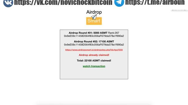 🔥1) Trecento (TOT) - http://bit.ly/2NuZyXv Баунти - https://vy.tc/g7Jor37 🔥2) BITHUB (BHC) - https://bit.ly/2NCyHZs 🔥3) Kkcoin (KK) - https://bit.ly/2Pwki2V 🔥4) AIRDROPSMART (ASMT) - http://bit.ly/MetaMaskLink (Metamask) Инструкция - http://bit.ly/MetaMaskInfo Переходим по ссылке: https://airdropsmart.io/check_balance... Обменник 1 - http://bit.ly/2wAtv1M Обменник 2 - http://bit.ly/2LKevrR 🔥5) ZOO - http://bit.ly/2zWgySF (гугл-форма) Telegram-bot - @ZOOAirdropBot Telegram-group - https://t.me/ethbirdsBountyAirDrop 🔥6) Coindy (CODY) - https://bit.ly/2yuJxLv