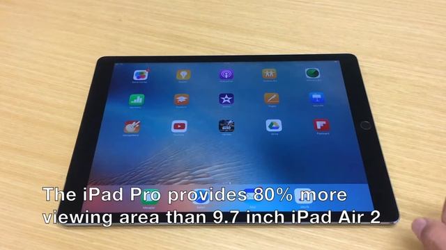 Here is the iPad Pro. With 12.9 inch screen size, it's the biggest tablet designed by Apple yet! It comes with an impressive 2048 x 2732 resolution. With 5.6 million pixels, iPad Pro features the highest‑resolution Retina display of any iOS device until today.