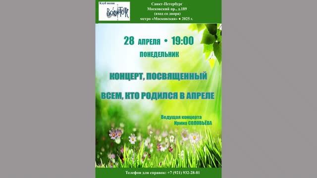 Концерт, посвящённый всем, кто родился в апреле. Ведущая - Ирина Соловьёва. Клуб песни «Восток». 28 апреля 2025 г. Видеозапись - Алла Левитан. Запись звука - Геннадий Демин, Герман Колосов. Афиша - Елена Демьянова-Семененко. Санкт-Петербург, Московский пр., д. 189.