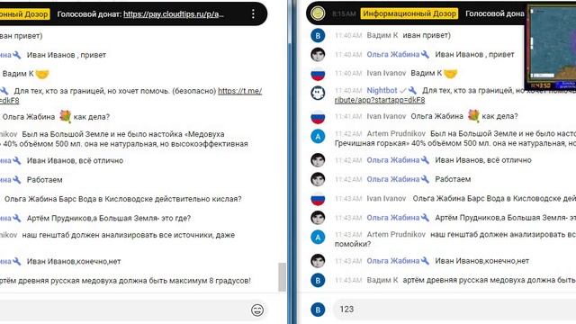 Смотрите в 720р 00:36 - Бан№1 (пропало мои 2 сообщения в левом окне) 1. Привет всем и 2. Я бы сразу написал... 02:15 - Бан№2 (пропало моё сообщение в правом окне) Ольга Жабина Чтобы заниматься ... 11:09 - Бан№3 (не появились мои сообщения в правом окне) 1. Ольга Жабина у Ivan Ivanov предательский флаг на аве и 2. 123 11:52 - Бан№4 (пропало моё сообщение в левом окне) Ольга Жабина у Ivan Ivanov предательский флаг!!! Это максимально возможное зеркало моего нового ютуб-канала Victor-live1