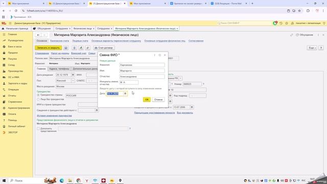 В видео показана пошаговая инструкция по смене фамилии сотрудника в программе 1С (конфигурация «1С:Бухгалтерия» в облачном сервисе 1С:Фреш). Краткое содержание действий: Поиск сотрудника: Необходимо зайти в справочник «Физические лица» (не «Сотрудники», а именно «Физические лица»), найти нужного человека и открыть его карточку. Смена данных: В карточке нажать на гиперссылку «Изменить ФИО». Ввод изменений: В открывшемся окне ввести новые данные (новую фамилию) и обязательно указать дату, с которой изменения вступают в силу. История: Автор видео показывает, что программа сохраняет историю изменений ФИО (старая фамилия остается в памяти системы). Результат: После нажатия «ОК» и «Записать и закрыть» данные автоматически обновляются и в справочнике «Сотрудники». Также автор напоминает, что после смены фамилии необходимо отдельно внести изменения в паспортные данные сотрудника.