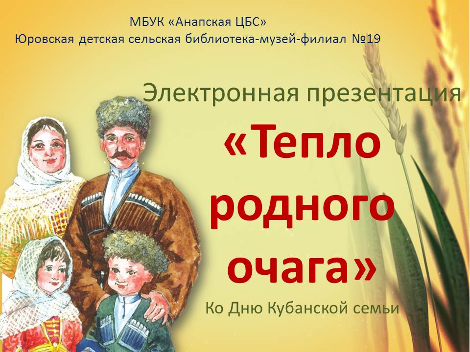 Электронная презентация «Тепло родного очага» в рамках федерального проекта «Крепкая семья». Чтобы подчеркнуть важность семейных ценностей, на Кубани с 2007 года в третье воскресенье сентября отмечается День Кубанской семьи. Этот праздник имеет несколько важных значений: он подчеркивает значение семьи, как основы общества. Он напоминает о том, что семья является местом, где формируются основные ценности, и где передаются традиции и культурное наследие, уважение к истории и казачьим традициям. Этому замечательному празднику и посвящается наша публикация. Ведь сплоченная семья является не только источником счастья, радости и любви, но и надежной защитой от всех жизненных неурядиц. Подготовлено главным библиотекарем Юровской детской сельской библиотеки-музея-филиала №19 И.А. Матюшовой
