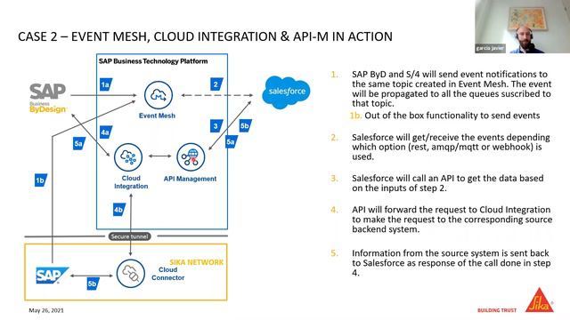 In this replay of Diverse Integrations at SIKA AG held on May 26th, Udo Paltzer, Product Manager, SAP Integration Suite, SAP SE, Tarun Baha, Team Head SAP Development Cloud & Integration at Sika AG and Javier Garcia, SAP Integration Consultant talk integration, sharing diverse enterprise integration scenarios from SIKA AG and how SAP’s integration technology is able to help quickly and efficiently create seamless, on-premise, in-the-cloud, and hybrid integrations. Learn more here: http://sap.to/6055yykHF Follow the tag in SAP Community http://sap.to/6056yykH2. You can also follow the speakers in the SAP community: Udo Paltzer Product Manager, SAP Integration Suite, SAP SE. http://sap.to/6057yykHN Tarun Bahal Team Head SAP Development Cloud & Integration at Sika AG http://sap.to/6059yykHf Javier Garcia EDI Stream Lead at Sika AG in SAP Community http://sap.to/6050yykHA