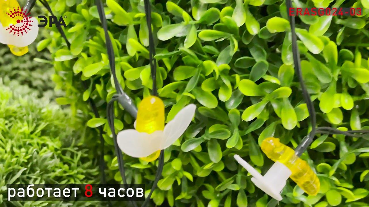 Уличная светодиодная гирлянда ERASG024-03 «Пчелки» станет ярким акцентом на Вашей дачной территории. Удобная конструкция и простая установка позволят Вам расположить гирлянду среди клумб, цветов и кустарников, красочно подсветить аллею, фасад здания или окно. Общая длина – 5,8 м. Подсветка работает от солнечной батареи. Такой способ получения энергии является наиболее экологичным и энергоемким. Питание происходит во включенном режиме «ON». С наступлением темноты маленькие пчелки загораются. Их животики заливаются желтым светом, создавая веселую атмосферу. Подсветка улицы может длиться непрерывно в течение 8 часов. Высокая степень пыле и влагозащиты позволяет оставлять светильник на улице даже во время дождя. Создавайте уникальное вместе с гирляндой «Пчелки» на солнечной батарее от производителя ЭРА! В электронном каталоге ЭРА: https://www.eraworld.ru/catalog/2649607 Официальный сайт ЭРА: http://www.eraworld.ru/ ЭРА в соцсетях: https://www.instagram.com/era_russia https://vk.com/era.russia https://www.facebook.com/ERA.russia/ https://m.ok.ru/era.russia/