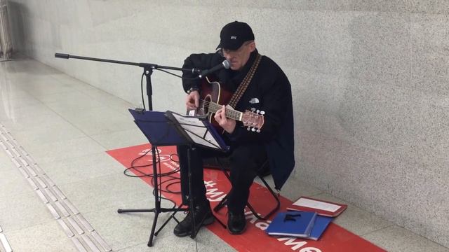 Уличный музыкант из Архангельска исполняет песни под гитару в метро Москвы.