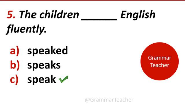 @GrammarTeacher Simple Present Tense Quiz / Present Indefinite Tense Test. This English quiz contains 10 questions to test your knowledge of Simple Present Tense. Revise your English tenses with us. Multiple Choice English Grammar test with answers. This English test contains examples of affirmative sentences in Simple Present tense. So if you are looking for simple present tense sentences or examples of present indefinite tense, then this video should help you too. Test your knowledge in this self-test. Timed test. English grammar test. English grammar quiz. Learn English for free. Keep your mind sharp. Take our quiz and enjoy. This video is for all the English learners. Even the English teachers can use this quiz to test the knowledge of English learners. Kindly subscribe to our channel Grammar Teacher. Please like the video and share it with others too. Free grammar exercise. English tenses. Morning Test. Daily quiz. Daily test. #tenses #grammar #simple_present_tense